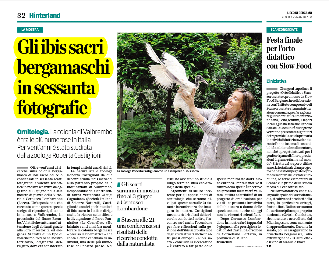 - 2018 Mostra fotografica scientifica “Ibis sacro” patrocinata dal Gruppo Ornitologico Lombardo e dalla Società Italiana di Scienze Naturali. Presso il Castello Borromeo di Corneliano Bertario (Truccazzano).