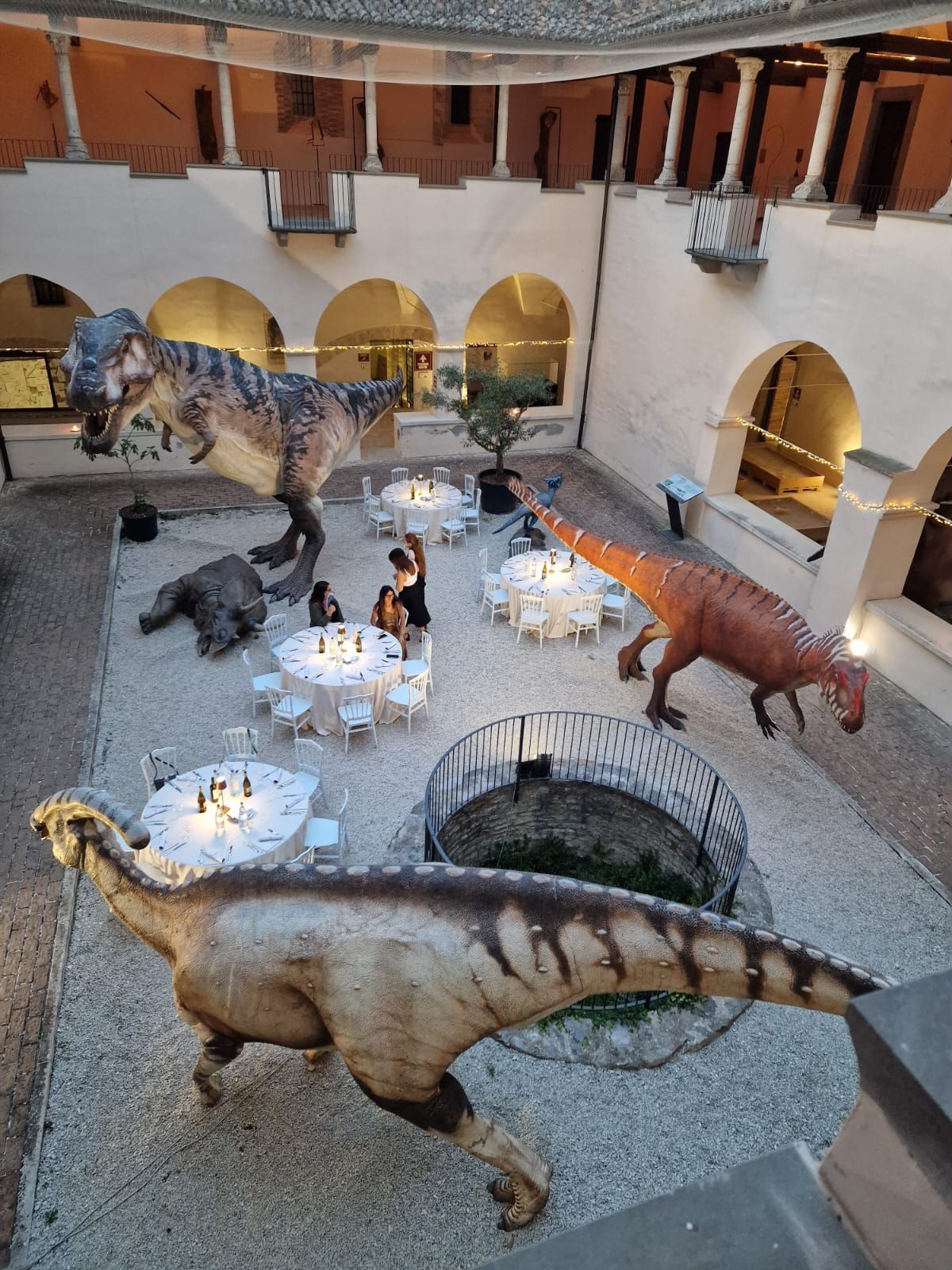 Indimenticabile la cena sotto i dinosauri nel chiostro dell’ex monastero di San Benedetto sede della mostRa Extintion: scienza e bellezza, in una sera fuori dal tempo.